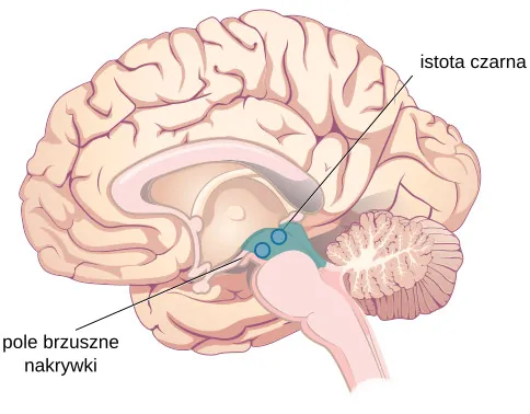 W śródmózgowiu znajdują się też substancja czarna (istota czarna) (łac. substantia nigra) i pole brzuszne nakrywki (ang. ventral tegmental area (VTA)) przedstawione na Ilustracji 3.24. W obu tych obszarach zlokalizowane są komórki wytwarzające dopaminę i oba odgrywają istotną rolę w sterowaniu ruchem. Degeneracja substancji czarnej i VTA występuje w chorobie Parkinsona. Oprócz tego obie struktury wpływają na nastrój, doświadczanie przyjemności i... uzależnienia (Berridge i Robinson, 1998; Gardner, 2011; George et al., 2012).