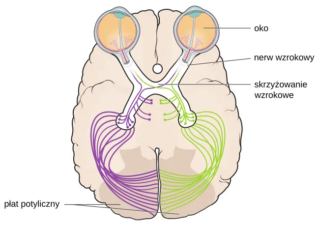 Nerwy wzrokowe wychodzące z każdego oka krzyżują się tuż poniżej tkanki mózgowej w punkcie zwanym skrzyżowaniem wzrokowym (ang. optic chiasm). Jak przedstawia Ilustracja 5.13, skrzyżowanie wzrokowe to struktura w kształcie litery X, która znajduje się tuż poniżej kory mózgowej w przedniej części mózgu. W punkcie skrzyżowania wzrokowego informacje z prawego pola widzenia (które pochodzą z obojga oczu) są przesyłane do lewej strony mózgu, a informacje z lewego pola widzenia są przesyłane do prawej części mózgu.