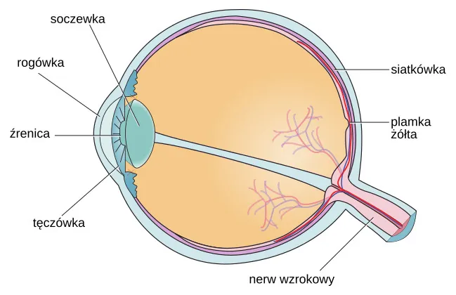 Głównym narządem wzroku (ang. vision) jest oko (Ilustracja 5.11). Fale świetlne przechodzą przez rogówkę i wchodzą do oka przez źrenicę. Rogówka (ang. cornea) to przezroczysta powłoka oka. Pełni funkcję bariery między wewnętrzną częścią oka a światem zewnętrznym i bierze udział w skupianiu fal świetlnych, które wchodzą do wnętrza oka. Źrenica (ang. pupil) to niewielki otwór w oku, przez który przechodzi światło. Wielkość źrenicy może się zmieniać w zależności od natężenia światła i od pobudzenia emocjonalnego. Źrenice rozszerzają się, gdy doświadczamy pozytywnych emocji lub przebywamy w otoczeniu o niskim natężeniu światła. Natomiast zwężone źrenice są naszą reakcją na silne światło i negatywne emocje. Zmiany wielkości źrenicy kontrolują mięśnie połączone z tęczówką (ang. iris), czyli kolorową częścią oka.