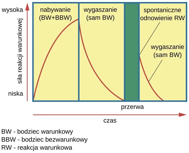 Oczywiście procesy te dotyczą również ludzi. Załóżmy na przykład, że każdego dnia, gdy przechodzisz przez kampus studencki, mija cię furgonetka z lodami. Dzień po dniu słyszysz muzykę (bodziec obojętny) płynącą z tej lodziarni na kółkach i w końcu przystajesz, aby kupić sobie lody czekoladowe. Zaczynasz je lizać (bodziec bezwarunkowy) i natychmiast ślinka napływa ci do ust (reakcja bezwarunkowa). To początkowy okres uczenia się, nazywany nabywaniem, kiedy zaczynasz łączyć bodziec obojętny (dźwięk z furgonetki) z bodźcem bezwarunkowym (smakiem lodów czekoladowych w ustach). Podczas nabywania reakcja warunkowa wzmacnia się poprzez powtarzanie pary bodziec warunkowy–bodziec bezwarunkowy. Kilka dni i kilka porcji lodów później zauważasz, że masz więcej śliny w ustach (reakcja warunkowa), gdy tylko usłyszysz muzyczkę dobywającą się z furgonetki — czyli na długo przed tym, zanim zabierzesz się za konsumowanie swoich lodów. Aż tu pewnego dnia idziesz ulicą i słyszysz melodyjkę (bodziec warunkowy) zbliżającej się lodziarni. Oczywiście ślinka napłynie ci do ust (reakcja warunkowa), jednak gdy dotrzesz do furgonetki, ku twemu wielkiemu rozczarowaniu dowiesz się, że nie ma już lodów! Przez kilka następnych dni mijasz pojazd i słyszysz dobywającą się z niego muzykę, nie zatrzymujesz się jednak i nie kupujesz lodów, żeby się nie spóźnić na zajęcia. Na dźwięk tej charakterystycznej melodyjki ślinisz się z każdym dniem coraz mniej, aż pod koniec tygodnia na odgłos tej muzyczki już nie napływa ci ślinka. Ten przykład obrazuje wygaszanie. Reakcja warunkowa słabnie, gdy pojawia się sam bodziec warunkowy (dźwięk z furgonetki), bez następującego po nim bodźca bezwarunkowego (lody czekoladowe rozpływające się w ustach). Nadchodzi weekend, a ty nie musisz iść na zajęcia, więc nie spotykasz już furgonetki z lodami. W poniedziałek rano udajesz się zwykłą drogą do miasteczka studenckiego. Za rogiem znów słyszysz lodziarnię. Jak myślisz, co się stanie? Tak, znów poczujesz smak śliny w ustach. Dlaczego? Po przerwie w warunkowaniu ponownie pojawi się reakcja warunkowa, co wskazuje na spontaniczne odnowienie.