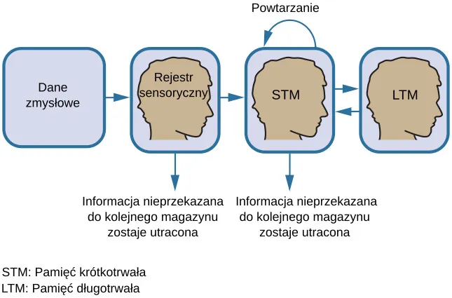 Żeby informacja trafiła do magazynu pamięci (czyli do pamięci trwałej), musi przejść przez trzy odrębne fazy: pamięci sensorycznej (inaczej: rejestr sensoryczny lub pamięć ultrakrótkotrwała), pamięci krótkotrwałej i wreszcie pamięci długotrwałej (inaczej: trwałej). Taki podział zaproponowali jako pierwsi Richard Atkinson i Richard Shiffrin (1968). Ich model ludzkiej pamięci (Ilustracja 8.4), nazwany modelem Atkinsona i Shiffrina (ang. Atkinson and Shiffrin's model) opiera się na założeniu, że przetwarzamy informacje na podobnej zasadzie, jak robią to komputery.