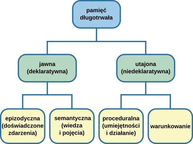 Istnieją dwa rodzaje pamięci długotrwałej: pamięć jawna (świadoma) (ang. explicit memory) i pamięć utajona (nieświadoma) (ang. implicit memory) schematycznie przedstawione na Ilustracji 8.6.